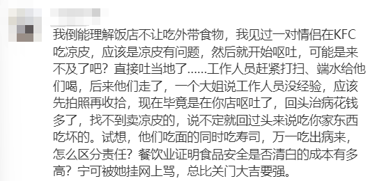 “我倒能理解饭店不让吃外带食物,我见过一对情侣在KFC吃凉皮,应该是凉皮有问题,然后就开始呕吐,可能是来不及了吧?直接吐当地了...工作人员赶紧打扫、端水给他们喝,后来他们走了,一个大姐说工作人员没经验,应该先拍照再收拾,现在毕竟是在你店呕吐了,回头治病花钱多了,找不到卖凉皮的,说不定就回过头来说吃你家东西吃坏的。试想,他们吃面的同时吃寿司,万一吃出病来,怎么区分责任?餐饮业证明食品安全是否清白的成本有多高?宁可被她挂网上骂,总比关门大吉要强。”