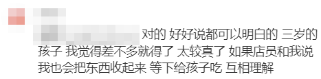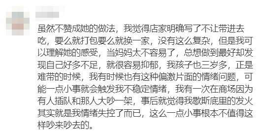 “一般好好说都可以明白的,三岁的孩子,我觉得差不多就得了,太较真了,如果店员和我说我也会把东西收起来,等下给孩子吃,互相理解。”“虽然不赞成博主的做法,我觉得店家明确写了不让带进去吃,要么就打包要么就换一家,没有这么复杂,但是我可以理解她的感受,当妈妈太不容易了,总想做到最好却发现自己好多不足,就很容易抑郁,我孩子也三岁多,正是难带的时候,我有时候也有这种偏激片面的情绪问题,可能一点小事就会触发我不稳定情绪,我有一次在商场因为有人插队和那人大吵一架,事后就觉得我歇斯底里的发火其实就是我情绪失控了而已,这么一点小事根本不值得这样吵来吵去的。”