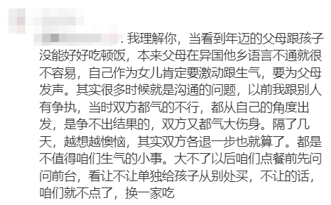 “我理解你,当看到年迈的父母跟孩子没能好好吃顿饭,本来父母在异国他乡语言不通就很不容易,自己作为女儿肯定要激动跟生气,要为父母发声。