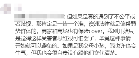 “但如果是真的遇到了不公平或者歧视,那肯定是一告一个准,澳洲法律就是偏帮弱势群体的,商家和商场也有保险cover。我刚开始只是觉得这样受害者思维很可怕罢了,毕竟这种事情一开始就可以避免的。如果是我父母小孩,我也许也会生气,但我也会很自责没有跟他们交代清楚。”