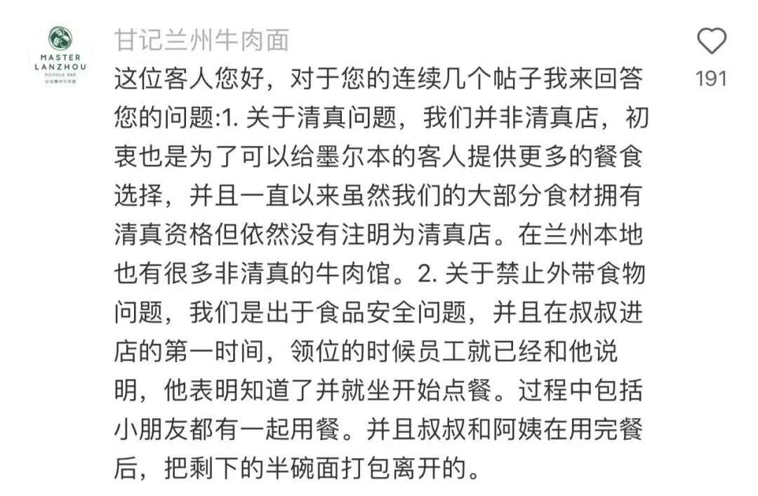 就在帖子发出后不久,小红书@甘记兰州牛肉面 给博主留言说明了当时的情况,