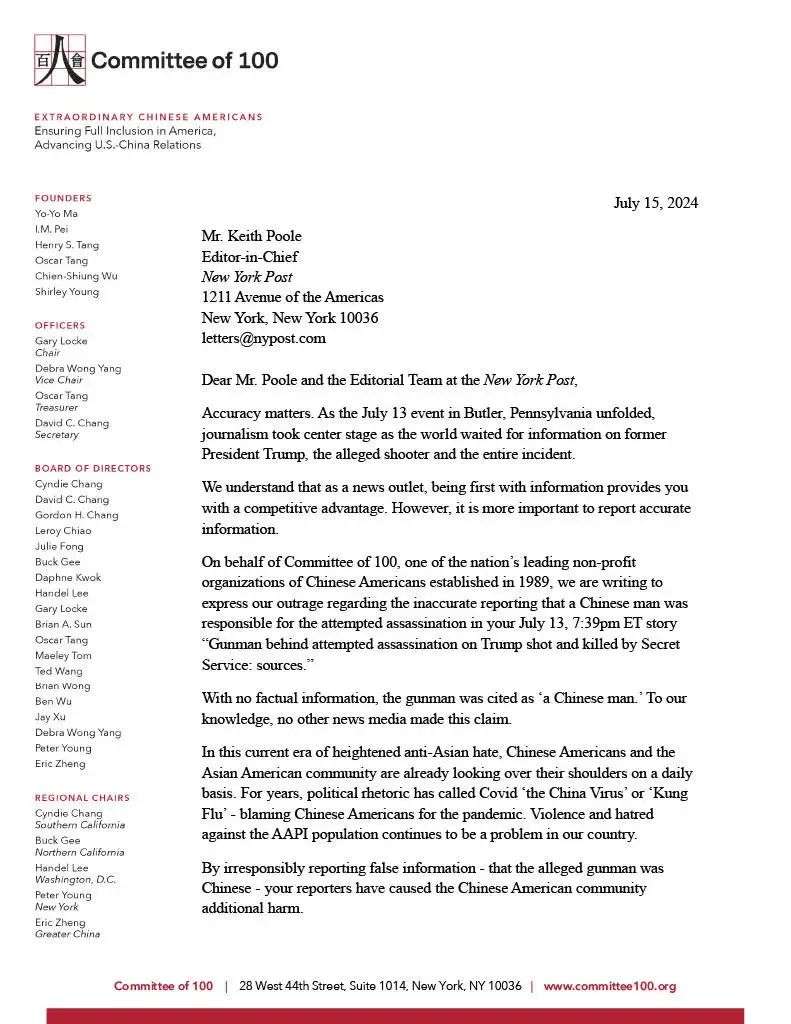 美国前驻华大使,“百人会”主席骆家辉在公开信中指出,《纽约邮报》的误报不仅是不负责任的,更是对美国华裔社区的进一步伤害。