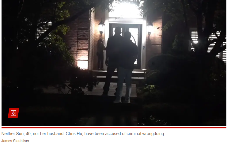 联邦调查局特工7月23日清晨突袭孙雯和其丈夫胡骁(Chris Hu)位于长岛北岸的住所,该住宅为一栋五卧房屋,价值约350万美元,这处房产原本由孙雯和胡骁拥有,但今年初被转移给信托基金;据内部人士称,目前无人被捕,但官方尚未透露调查原因,40岁的孙雯和41岁的胡骁均未被指控有不当行为,两人暂未作出回应。