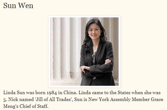 据悉,孙雯五岁随父母来美,能讲流利中文,八岁起开始帮父母做翻译和报税;根据其领英(LinkedIn)档案,她拥有巴纳德学院(Barnard College)政治学学士学位和哥伦比亚大学(Columbia University)教育学院硕士学位,在州府工作近12年,担任过多个职位。