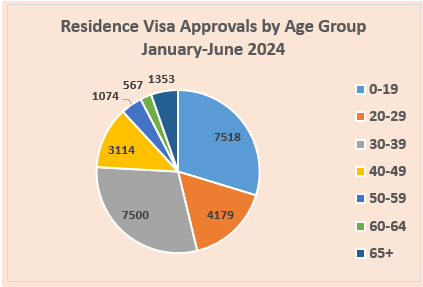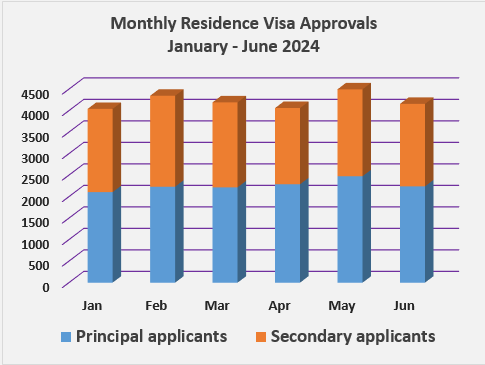 2024 年上半年,每月批准的居留签证数量保持在 4038 至 4497 之间的一个相当窄的范围内,表明目前的居留签证批准数量相当一致。