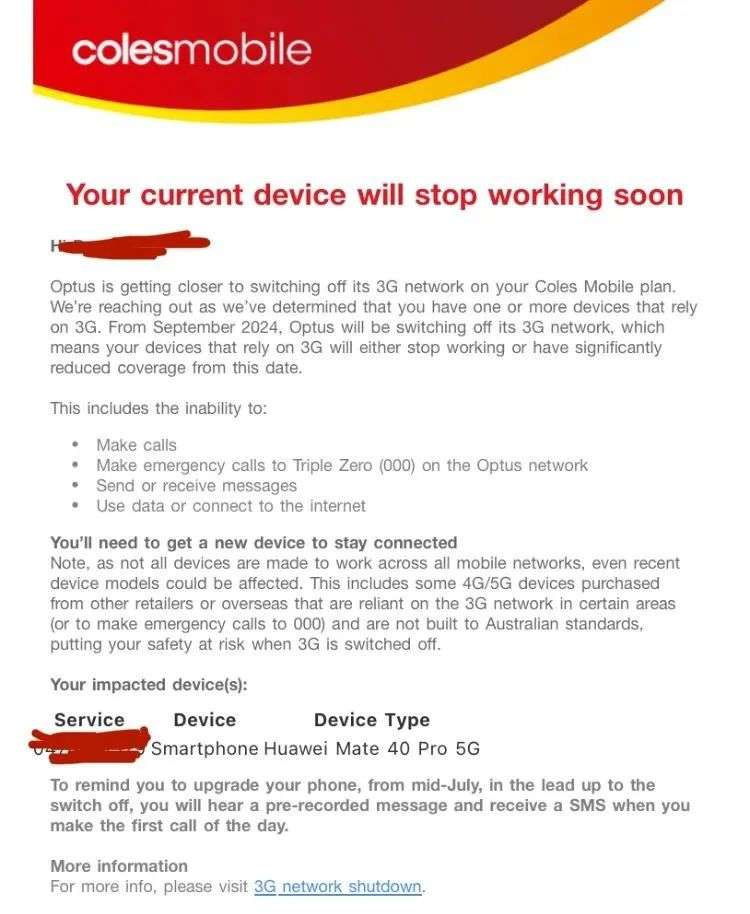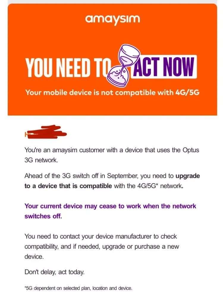 “您的设备使用的 Optus 3G 网络,该网络将于8月底关闭,您需要立即行动!”