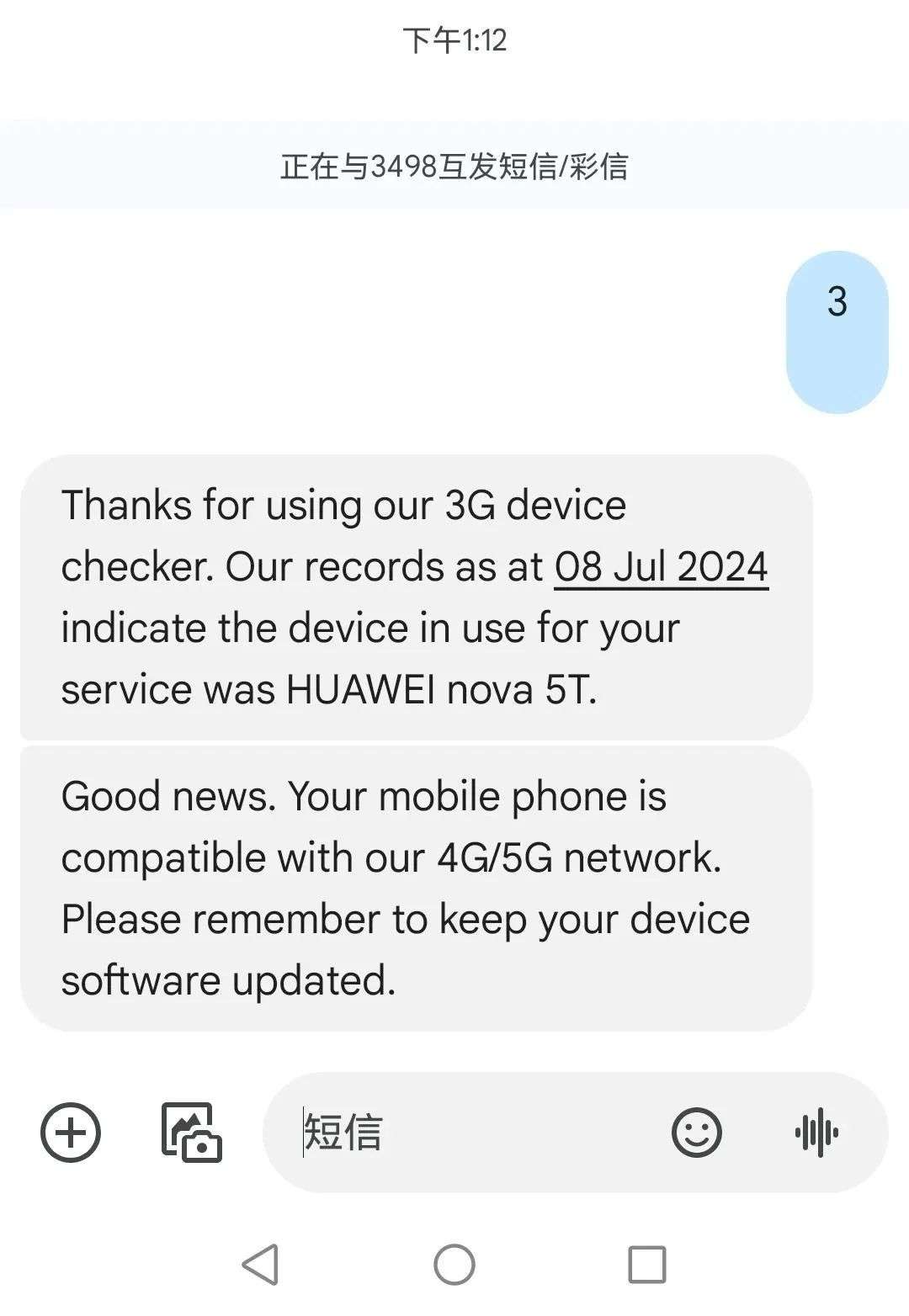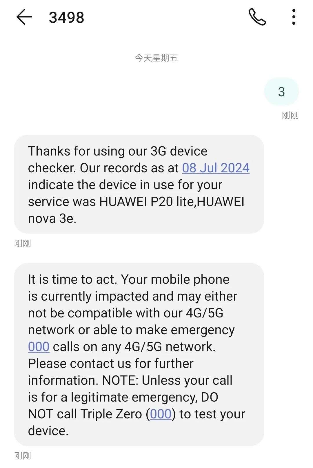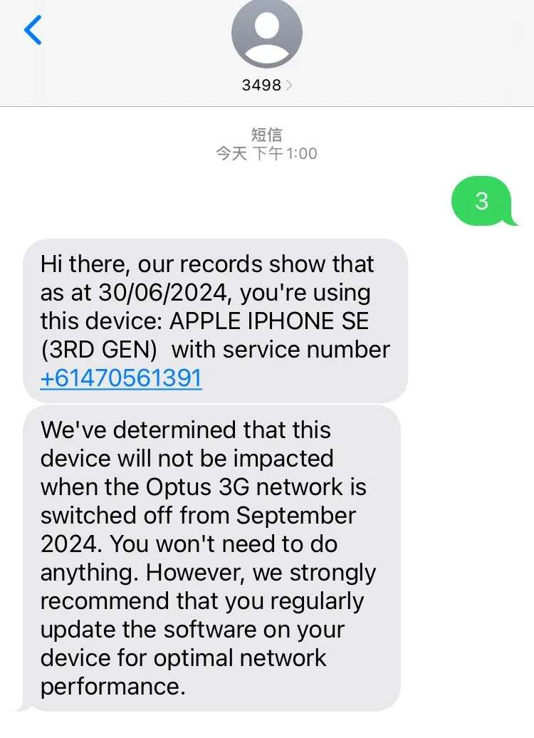任何网络的移动客户都可以向‘3’发送短信‘3498’,并会立即收到有关他们的移动手机是否会受到 3G 切换影响的回复。
