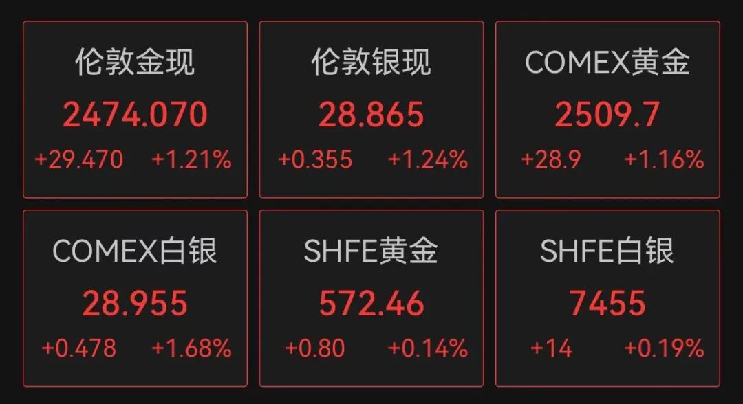 金银一度联袂大涨。COMEX黄金期价涨1.16%,报2509.7美元/盎司,伦敦金现涨1.21%,报2474.07美元/盎司;COMEX白银期价涨1.68%,报28.955美元/盎司,伦敦银现涨1.24%,报28.865美元/盎司。