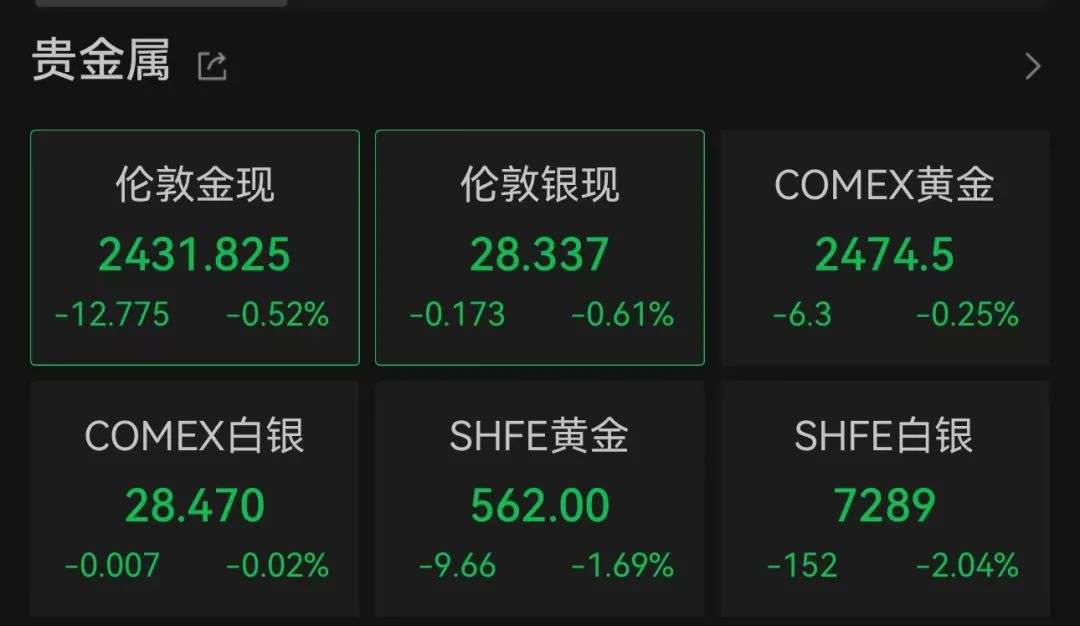截至发稿,黄金在内的多数贵金属已由涨转跌。