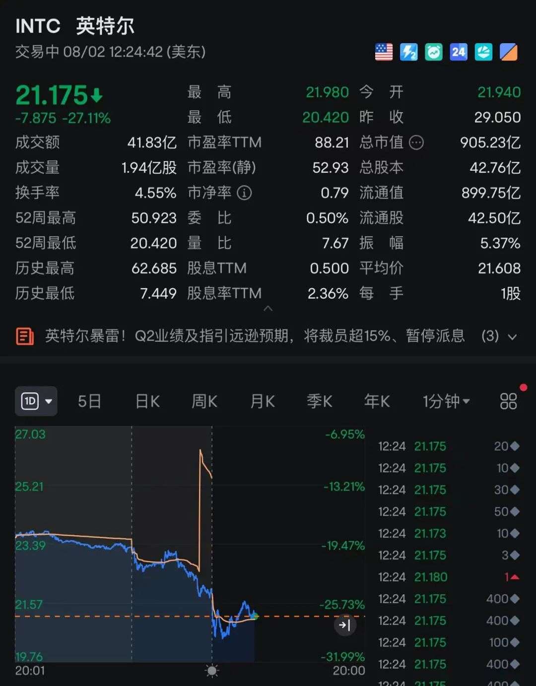 多只大型科技股大跌,英伟达一度下跌6.80%;英特尔股价一度大跌29%,创下至少自1982年以来的最大跌幅,截至发稿,英特尔下跌27.11%,亚马逊跌8.76%。