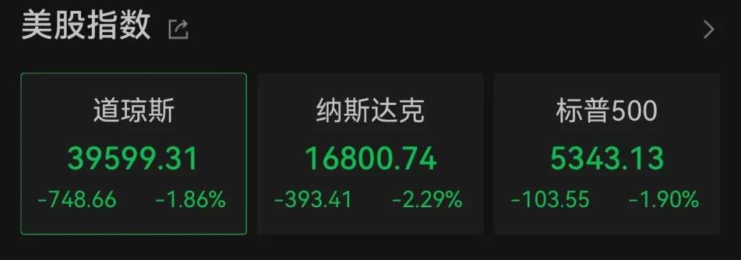 截至发稿,三大指数跌幅缩小,道指跌超748点,跌幅1.86%,报39599.31点;纳指跌393.41点,跌幅为2.29%,报16800.74点;标普500指数跌103.55点,跌1.90%,报5343.13点。