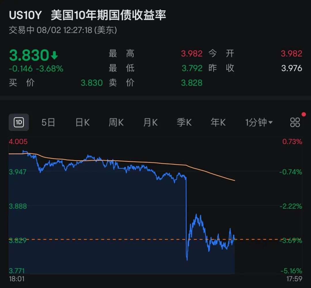 美债收益率迅速下行,美国10年期国债收益率一度下跌19个基点,至年内低点3.79%。截至发稿,跌幅缩小至3.68%。美国两年期国债收益率跌至2023年5月以来的最低水平。