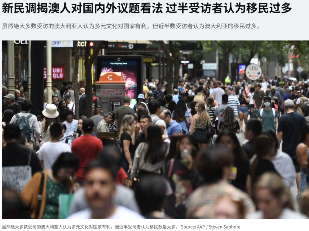 一次最新民意调查显示,虽然绝大多数受访澳人认为多元文化对国家有利,但近半数受访者认为澳大利亚的移民太多。