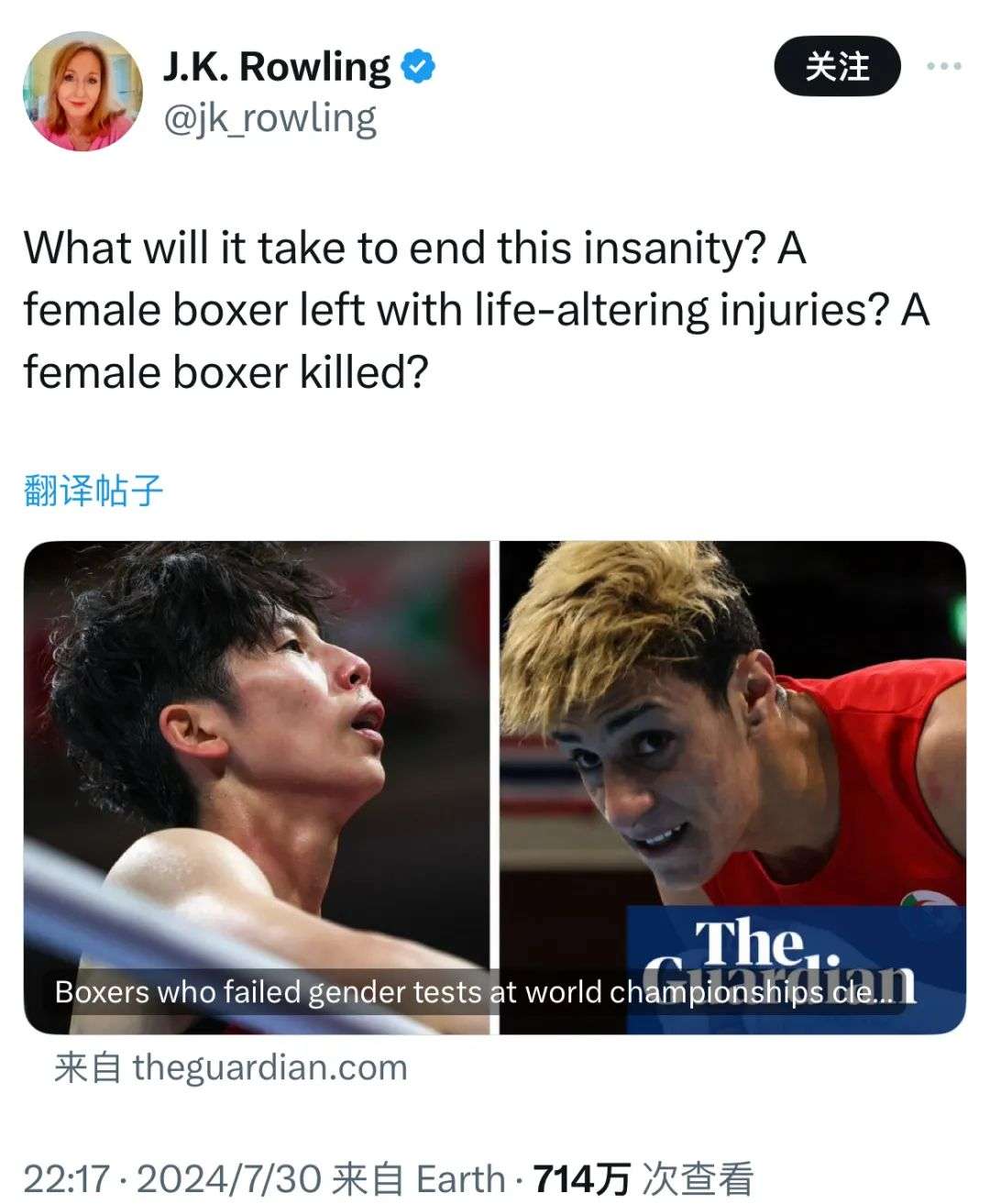 Khelif是一位跨性别运动员,护照上的性别为女,IOC(国际奥委会)认为她符合参赛标准。