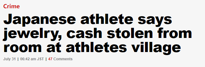 据报道,日本橄榄球运动员在奥运村里遭遇盗窃,已于28日向当地警方报案。
