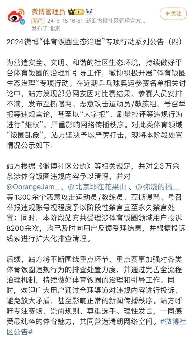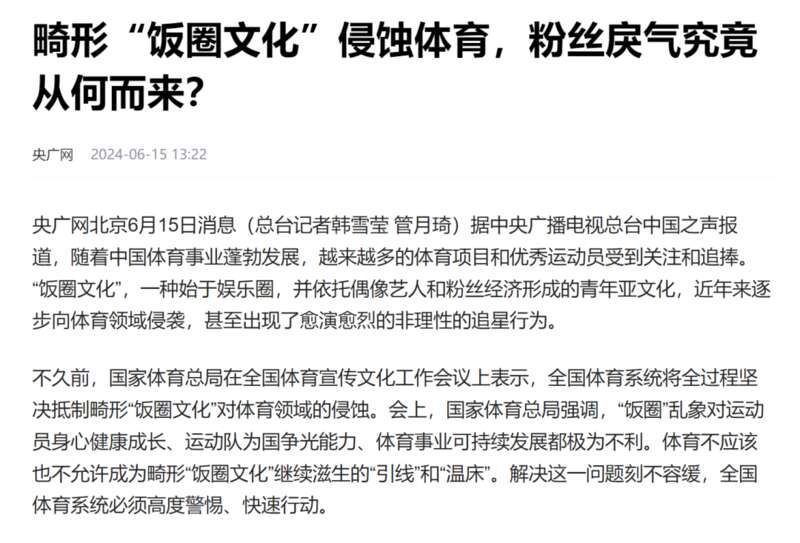 今年6月份,国家体育总局就在全国体育宣传文化工作会议上表示,全国体育系统将全过程坚决抵制畸形“饭圈文化”对体育领域的侵蚀。