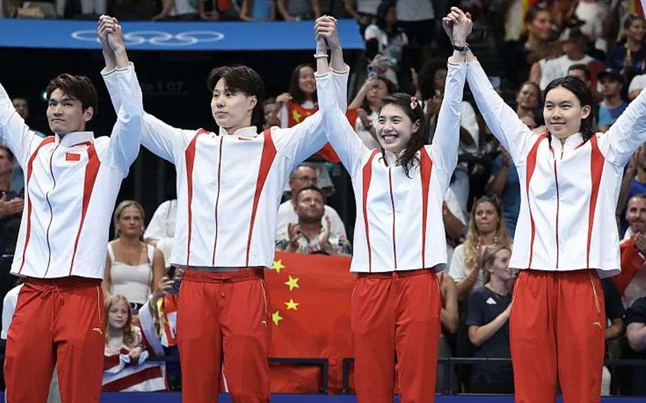在巴黎奥运会游泳男女混合4×100米混合泳接力决赛中,由徐嘉余、覃海洋、张雨霏、杨浚瑄组成的中国队以3分37秒55刷新亚洲纪录的成绩获得银牌。