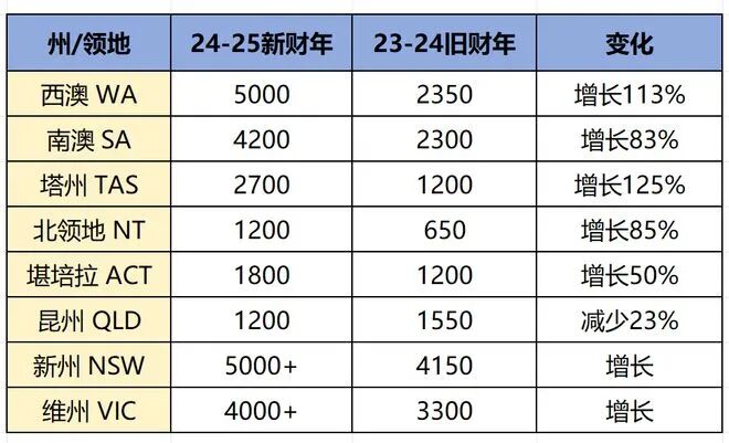 澳洲移民局官网正式更新了2024-2025财年,各州的州担保技术移民配额。与上一财年相比,几乎每个州的配额都得到了增长!