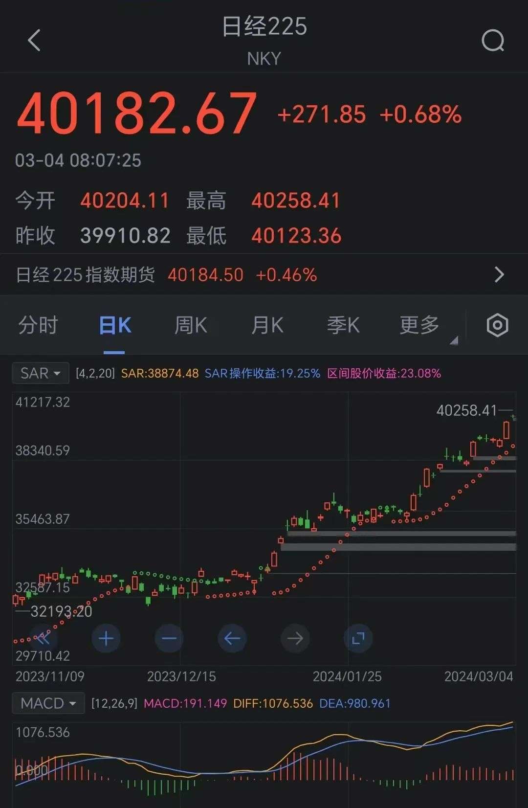 正是在巴菲特的带动下,全球投资者开始大举进军日本股市。2023年,海外投资者在日本股市净买入超过3万亿日元,在海外投资者的推动下,日本股市开始快速上涨,2023年,日经225指数的累计涨幅高达28%,涨幅高居全球第二。到了2024年3月初,日经225指数更是突破了40000点大关,一举突破了90年代的泡沫高点。