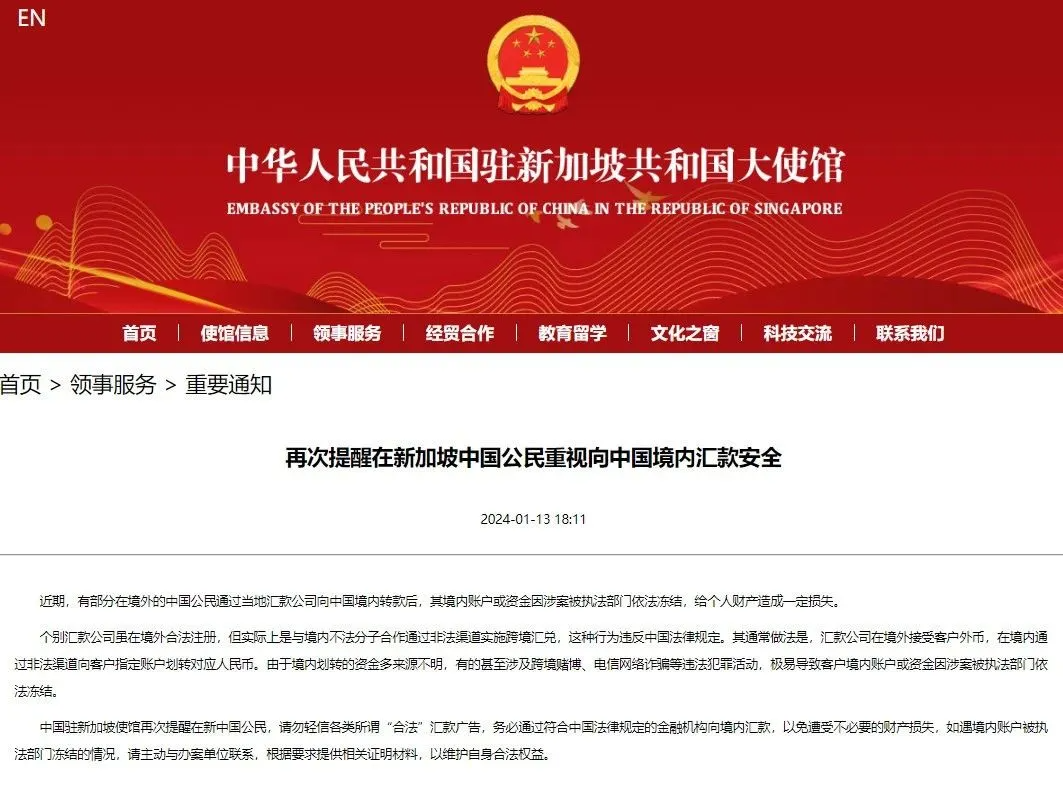 早在今年1月,驻新加坡大使馆发布了一则重要提醒,告诫海外华人: