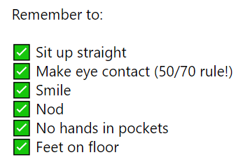 她的其他建议还包括“坐直、和对方目光接触、微笑、点头、不要把手插在口袋里、不要把脚放在地板上”。