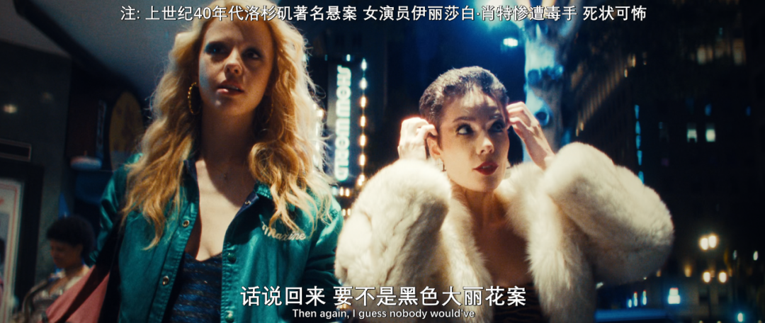 开头部分通过新闻播报的方式,交代连环杀人案后,玛克辛的女同事便对此事进行了一番黑色调侃,提到了四十年末期骇人听闻的“黑色大丽花”悬案。
