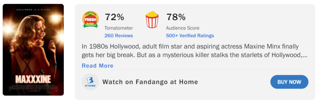 得益于前两部电影的口碑和声势,《玛克辛》在上映期间,票房还算不错,拿到了快两千万美元的成绩,但其烂番茄新鲜度仅为72%,相比于《X》《珀尔》的评分都在90%以上,专业影评人显然不太买账。