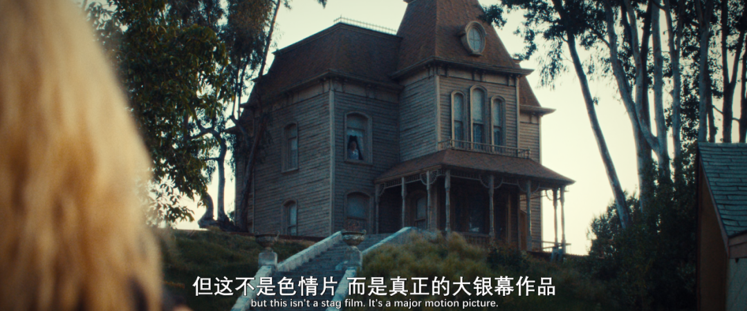到了玛克辛在好莱坞片场,被邪恶的私家侦探追逐时,画面里又出现了希区柯克的《惊魂记》中的经典场景——贝茨旅馆。