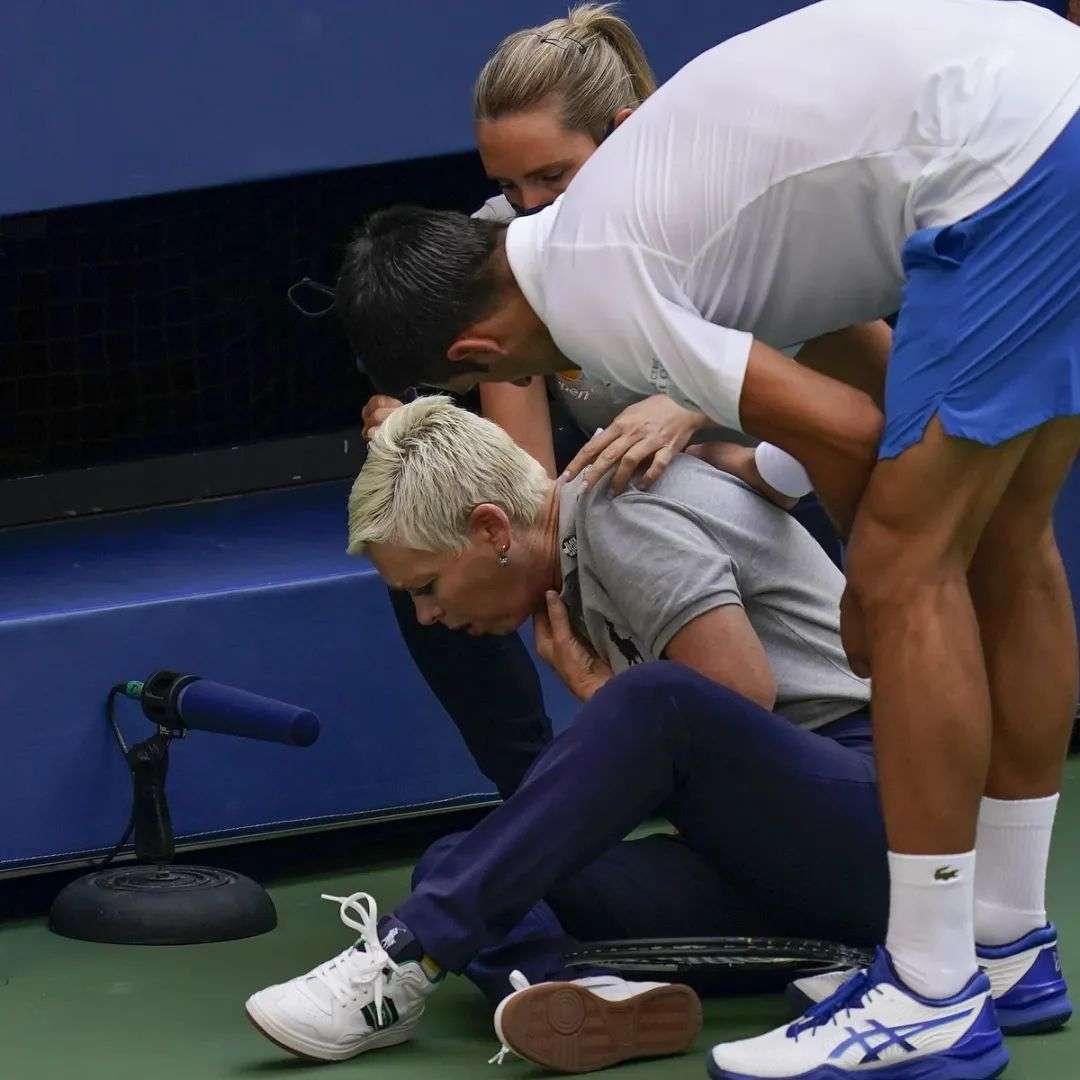 2020年美网,德约在第四轮对阵西班牙球员布斯塔时不小心将网球打到了一名边裁的喉咙上。德约当时是因为自己发球局丢了,郁闷的发泄,是无心之失。德约看到以后也立刻上前查看并道歉了,但在经过主裁和赛事主管商议后,德约根据规则被直接判负,清除了参赛积分并且还要罚款。