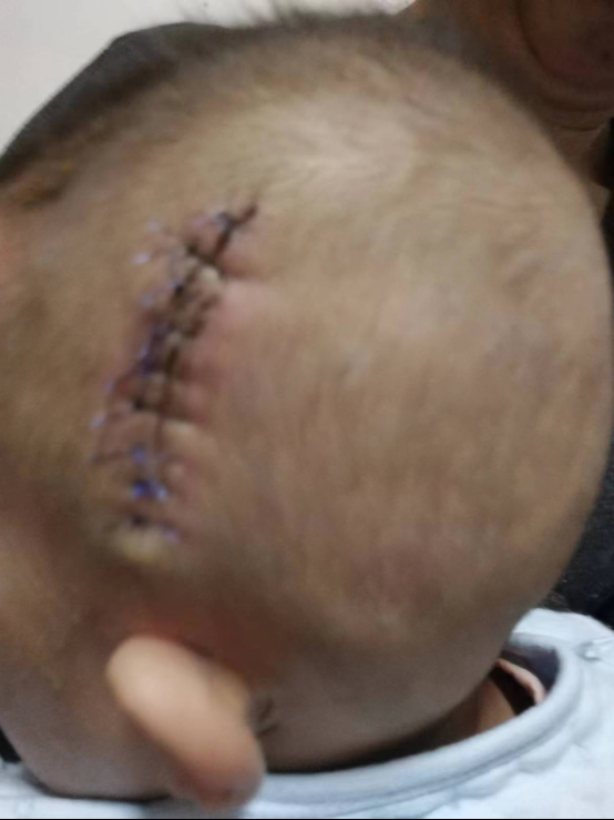 ▲2018年12月,第一次手术失败后,小白头部10厘米长的伤口缝线。受访者供图