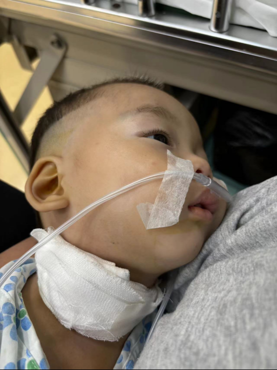 ▲2024年5月30日,第二次异物取出手术成功后,童童发着高烧。受访者供图