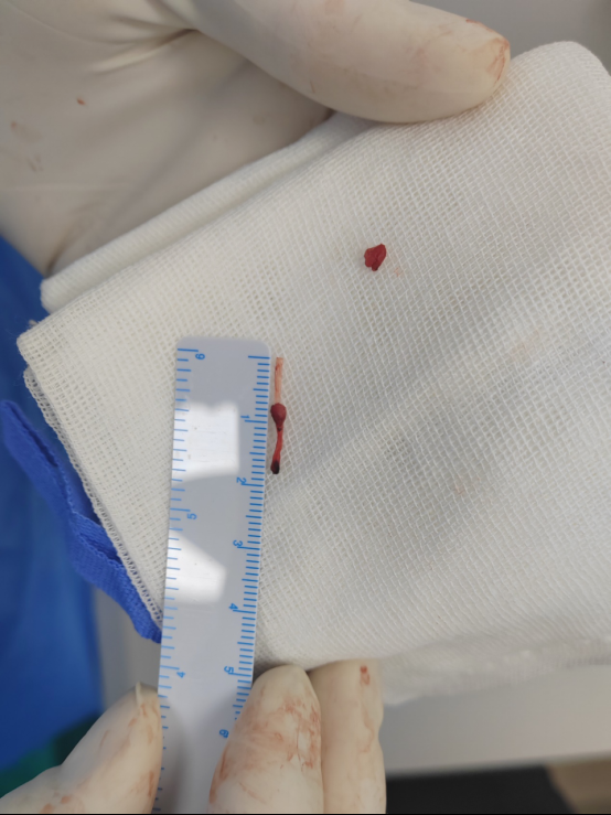 埋在小白体内五年的“炸弹”被取出来了。那是一截18毫米长、牙签粗细的透明塑料导管,带着一点血迹,被医生放在一块纱布上。