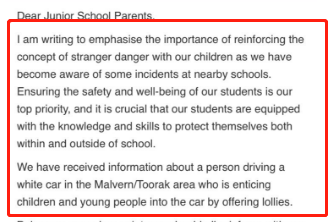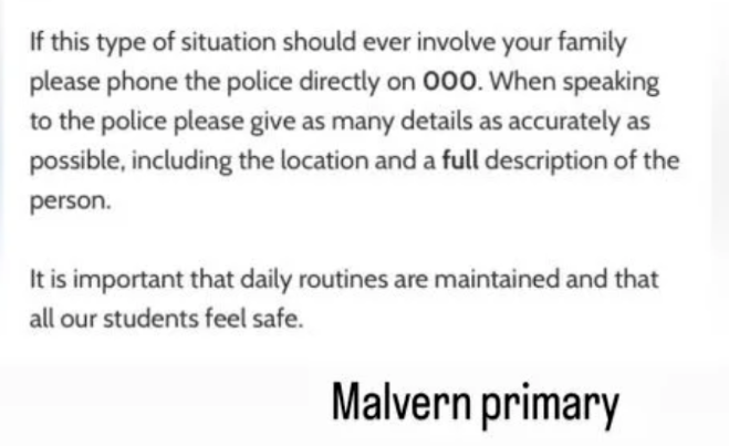 另一封据称是根据 Malvern Primary School 小学发给社区的一封提醒邮件也发出了类似警告,具体如下所示: