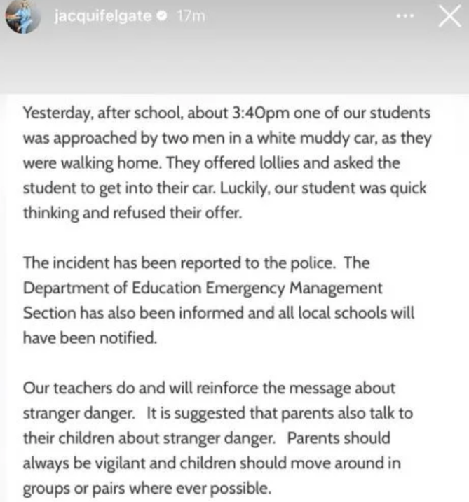 学校随后向家长和监护人发送了电子邮件,向他们发出了警告,并询问是否遇到做出类似行为的陌生人。