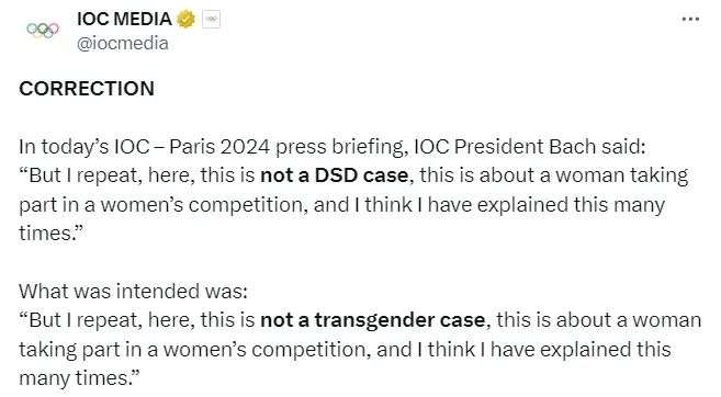 巴赫在周六的记者会上曾提到:“我们在这里讨论的不是变性人的问题。这是关于一名女子参加女子组别的比赛。我在此重申,这不是一个DSD案例。”IOC随后在X上修正称,巴赫当时想说的是,这不是一起“变性案例”。