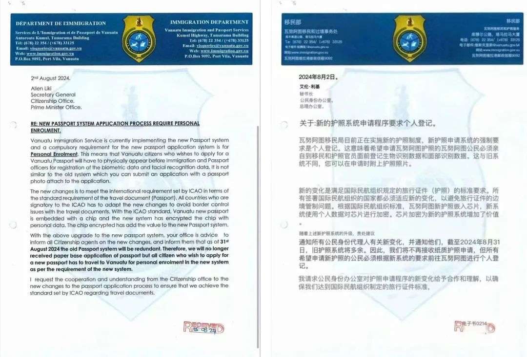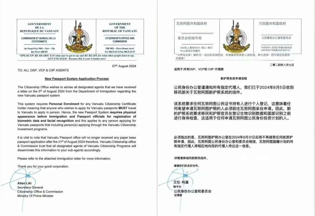 当地时间8月7日,瓦努阿图移民局发布关于新的护照系统申请程序强制要求个人登记的通知。这意味着希望申请瓦努阿图护照的投资人必须亲自出现在移民和护照官员面前,登记生物识别数据和面部识别数据。