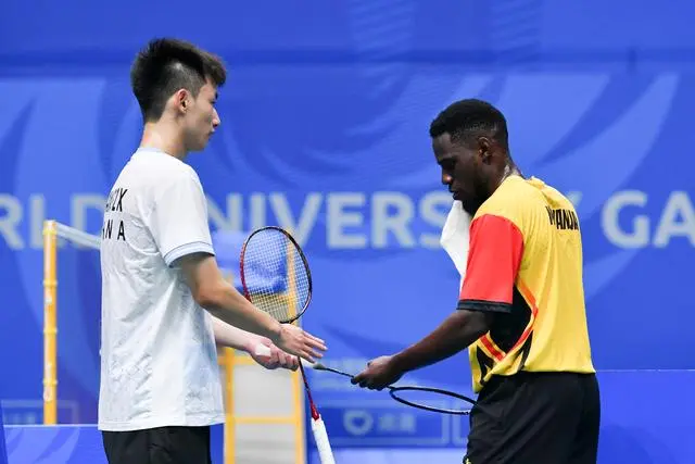 是大运会上,中国羽毛球男单选手王正行,在对手乌干达运动员的球拍坏了又没有备用拍的情况下,主动把自己的备用球拍给对方使用;