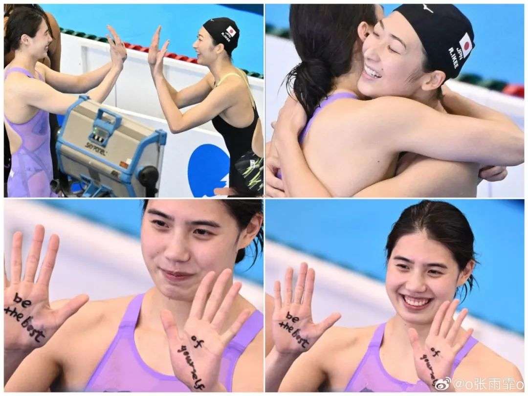 在池江复出后的世锦赛上,张雨霏也在手上写下“做最好的自己”,与对方击掌。