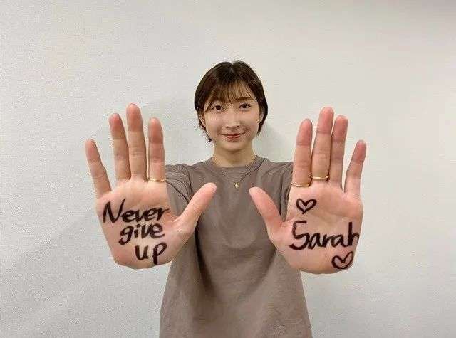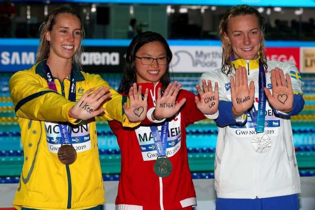 世界纪录保持者Sarah Sjöström,得知池江在与白血病作斗争时,拉着领奖的两位选手一起,在手掌上写下“永不放弃”的鼓励,为池江加油。
