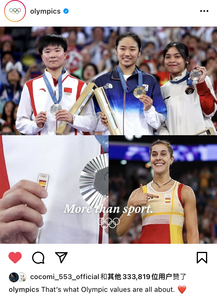 是中国羽毛球运动员何冰娇获得银牌后,在领奖台上拿着西班牙国旗徽章,向伤退的马林致敬;