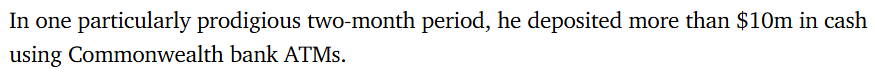 据悉,他为了避免触发申报要求,每笔交易都低于1万澳元,这也导致存钱的过程通常持续超过一个小时。