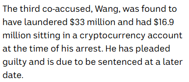 第三名同案被告Wang被发现洗钱3300万澳元,被捕时加密货币账户中有1690万澳元。他已经认罪,并将于晚些时候被判刑。