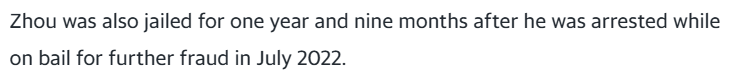 Zhou还被额外判了1年9个月监禁,原因是他在2022年7月保释期间,参与了进一步的欺诈行为。