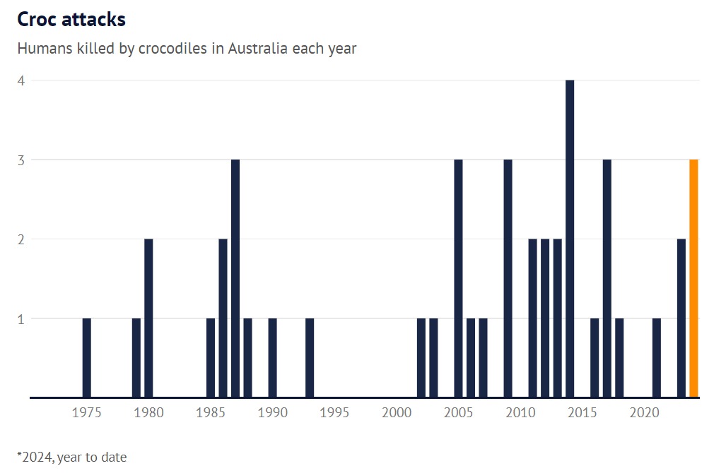 相比之下,从20世纪70年代到21世纪初,每年有14人被鳄鱼咬死。