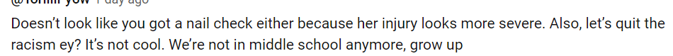 看起来你也没有检查指甲,因为她的伤势看起来更严重。另外,别再歧视了吧?这可不酷。我们已经不是初中生了,成熟一点吧