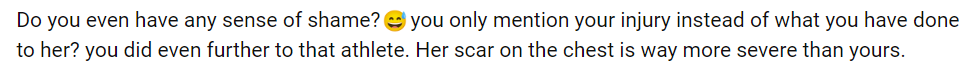 你还有点羞耻心吗?你只提到你的伤势,却不提你对她做了什么?你对那位运动员做的更过分。她胸口的伤疤比你的严重得多。