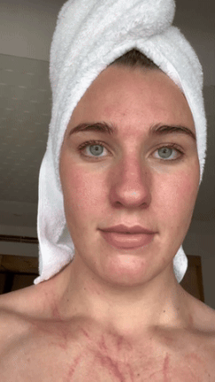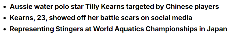 去年7月,她参加完世界游泳锦标赛对阵中国队的比赛后,在TikTok和 Instagram 上晒出她的胸口、肩膀和颈部被对手的指甲抓出多道难看的伤痕。