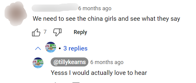 我真的很想听听中国女孩那边的说法,对此,Tilly也回应道,我也很想听听