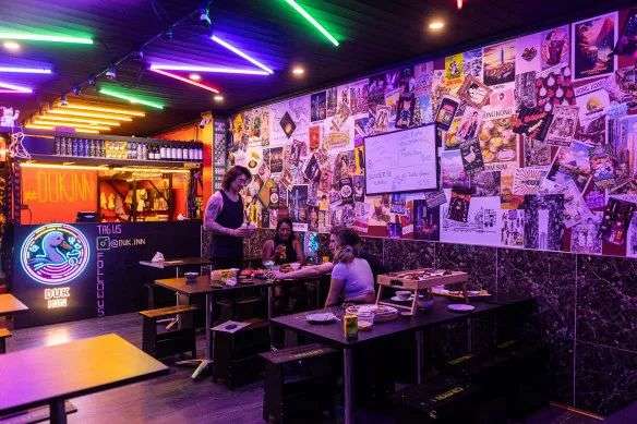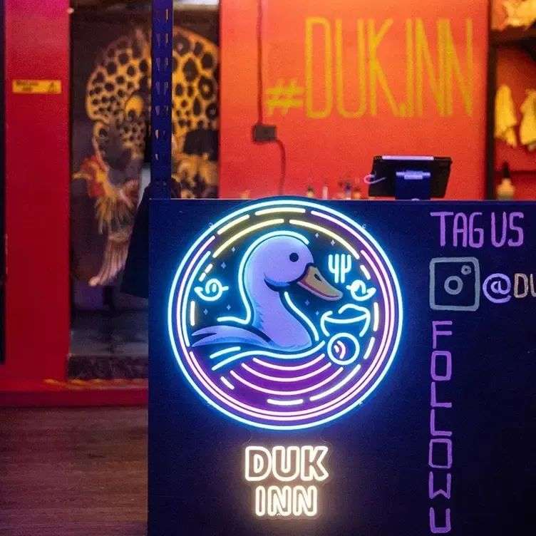 Duk Inn的室内装饰色彩鲜艳,配有五彩缤纷的霓虹灯以及一幅骑着橡皮鸭的招财猫壁画。