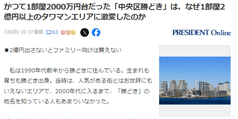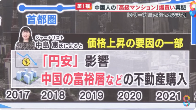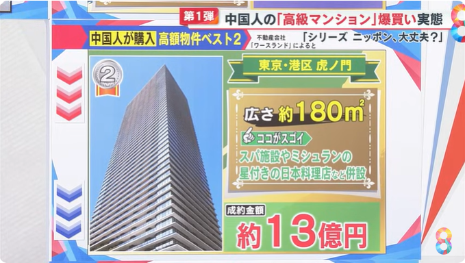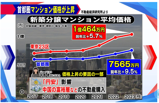 出手阔绰的国人也再一次刷新了日本人的认知,“中国人不仅喜欢在日本爆买各种商品、奢侈品,更喜欢爆买房产。”要知道,这两年日本的高级公寓被很多国人大手笔拿下。在日本系列报道的电视节目中,一名中国男子在东京新宿区的一个豪华塔楼公寓购买了一间房,其售价为2亿1500万日元,直接以现金全额支付。日本房地中介的老板野宫武美说,咨询这间房的客人大概有30多组,其中90%都是中国人,2024年4月这套房子出售的信息才披露出来,仅仅到了6月末就已经成交了。在东京都的港区和涩谷区也有国人分别购买了价值约13亿日元和20亿日元的公寓。有人指出,正因为是中国人涌入大量购买日本房产才导致日本房价节节高升。根据不动产经济研究所的数据显示,2023年东京首都圈新建公寓均价为7566万日元,同比增长9.5%,连续三年创历史新高。 特别是东京23区,价格上涨了5.7%,达到1亿464万日元,首次突破1亿日元大关。日本人也不禁担心,这样继续下去是否会继续导致日本人无法在好地段购买得起公寓呢?熟知中国情况的专家记者中岛惠也谈了自己的看法。中岛惠说,据她的了解,中国人最喜欢的房子是能看到东京塔或者富士山。此外,要是还能看到海景那就更好了。因为在中国的一线大城市中,能看到海景的房子并不多见。而这些购买日本豪宅的群体大多是年收入在几亿日元以上的富人,更多的则是年收入几百亿日元的富人。虽然有的富豪会购买20亿日元左右的豪宅,但大多数有钱人购买的房产都在1亿至2亿日元之间。这些爆买日本房产的有钱人中也有一小撮是小富人,他们年收入在2亿至3亿日元左右。当然也不缺乏中产阶级也凑热闹,因为日元历史性的贬值,让不少人看到了投资的绝佳机会,因此很多中国中产阶级的上班族和大公司的员工也会加入到购买大军的行列。1、日元跳水式的贬值。不少人赶着吃这一波日元贬值的红利。2、日本房价较低。与世界上大多数发达国家相比,日本的房价算是真的很便宜,相比伦敦来说,基本上可以说是半价。1、投资。日本房产价格火箭式地上涨,让不少投资者看到了利益。东京都中央区2000年左右只要2000万的塔楼公寓,如今摇身一变,变成了2个亿。短短20多年的时间就暴涨了10倍,这种一本万利的生意任谁看了都会眼红。2、自住:随着这些年大量国人涌入日本,自住房也随之增多,像日本的有钱人一样,比起一户建,有钱人更喜欢洋气又高大上的塔楼公寓。